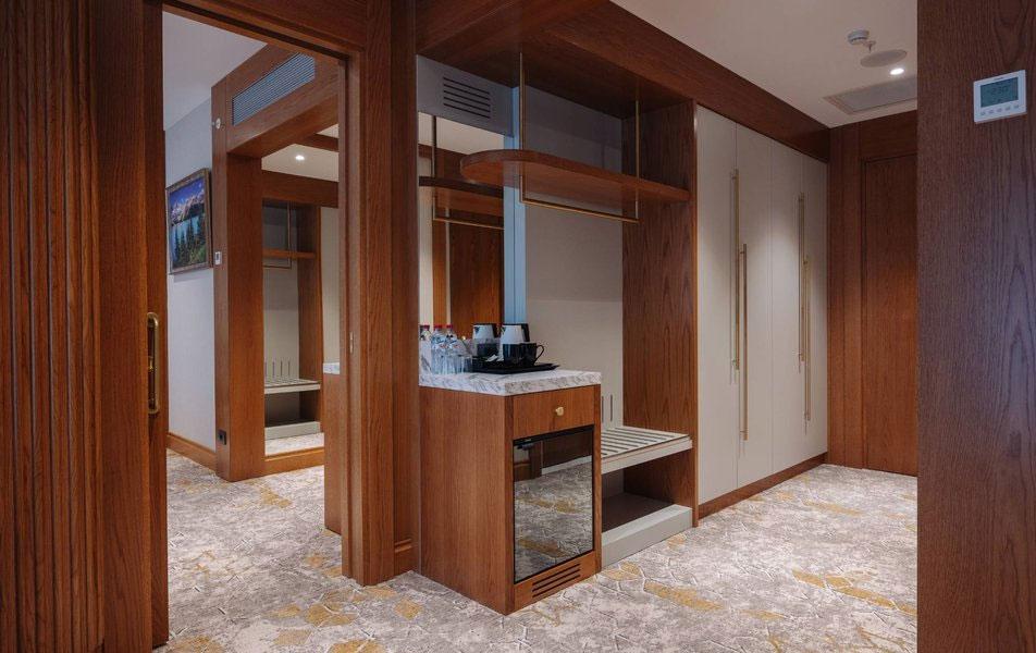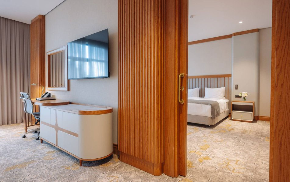 Продуманная архитектура номера включает два отдельных входа и два полноценных санузла с ванными комнатами, что создает абсолютную независимость для всех гостей. Каждая зона существует автономно, но при этом объединена в единое гармоничное пространство премиального уровня.